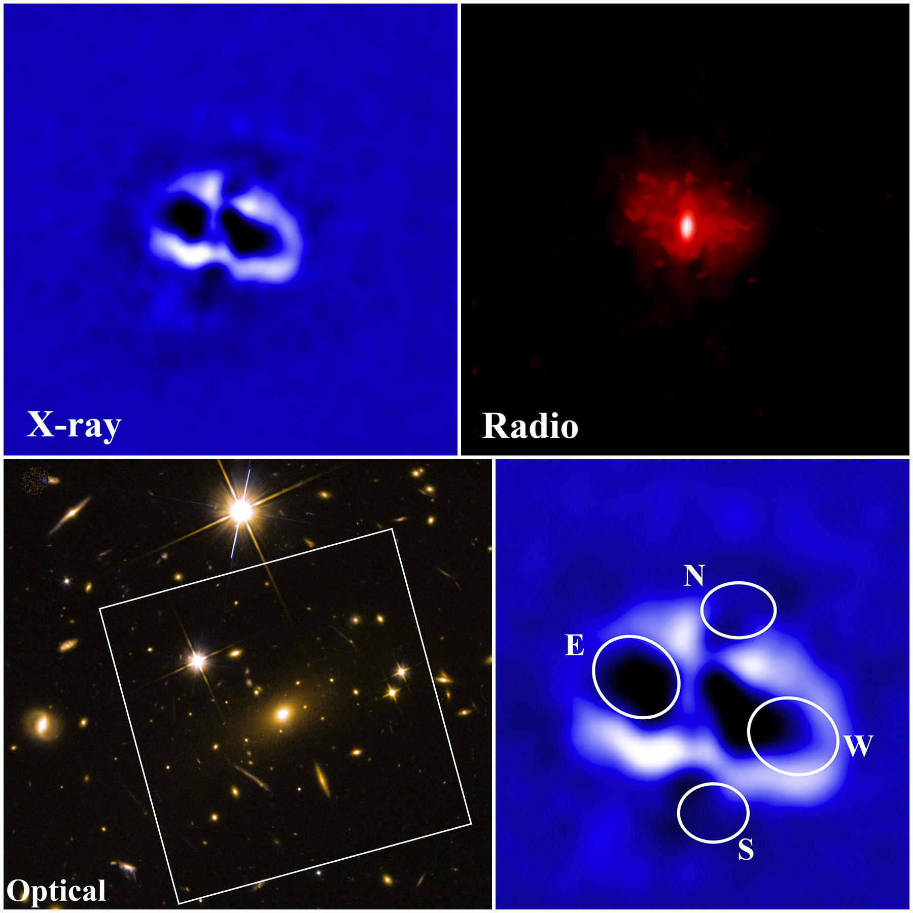 L’ammasso di galassie Rbs 797 osservato nei raggi X dal telescopio Chandra X-ray Observatory (in alto a sx e in basso a dx) e, per confronto, l’immagine radio e ottica. Crediti: Nasa / Stsci / M.Calzadilla; Nasa / Cxc / Università di Bologna / F. Ubertosi