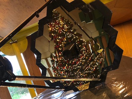 L’albero di Natale del centro Estec dell’Esa, nei Paesi Bassi, si riflette nello specchio principale di un modello in scala 1:10 del telescopio spaziale James Webb. Crediti: Esa–G. Porter