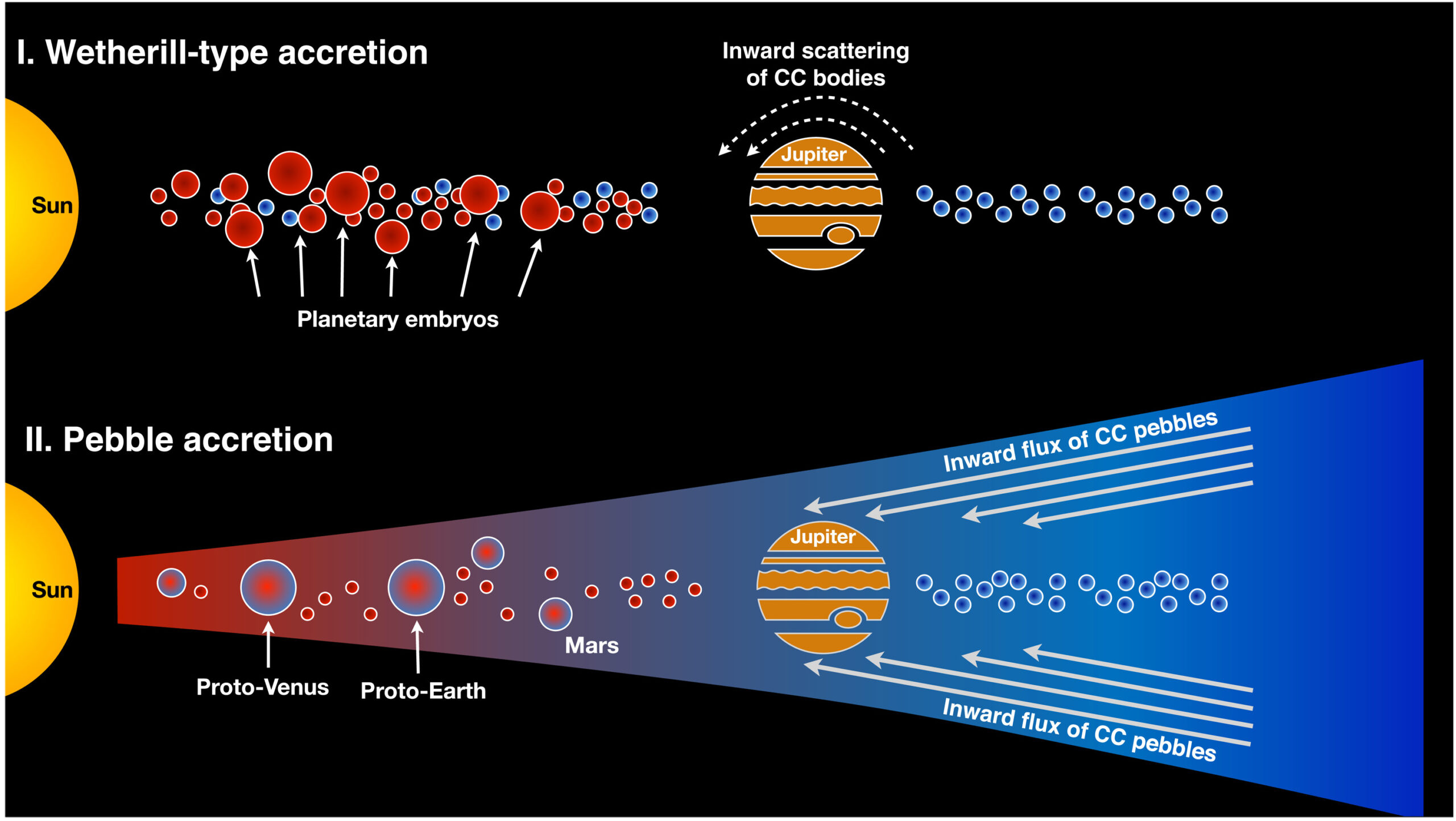 Collisioni fra embrioni planetari o accumulo progressivo di minuscoli ciottoli alla deriva? Le teorie sul processo di formazione dei quattro pianeti interni del Sistema solare – fra i quali il nostro – si sono progressivamente ridotte a queste due alternative. Secondo la prima, tutto è avvenuto con materiali raccolti sul posto – ovvero, nel Sistema solare interno. La polvere qui presente si è agglomerata a formare corpi sempre più grandi – gli embrioni planetari, appunto – raggiungendo gradualmente dimensioni paragonabili a quelle della Luna. Collisioni successive fra questi embrioni planetari hanno infine prodotto i quattro pianeti interni: Mercurio, Venere, Terra e Marte. Una teoria più recente propone invece uno scenario nel quale buona parte della materia prima arriva dal Sistema solare esterno sotto forma di pebbles – polvere e ciottoli di dimensioni millimetriche. Migrando dalla periferia verso il Sole, questi ciottoli si sono man mano accumulati sugli embrioni planetari rendendoli sempre più massicci, fino alle dimensioni attuali.