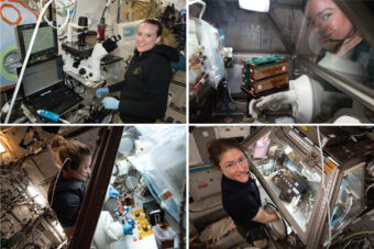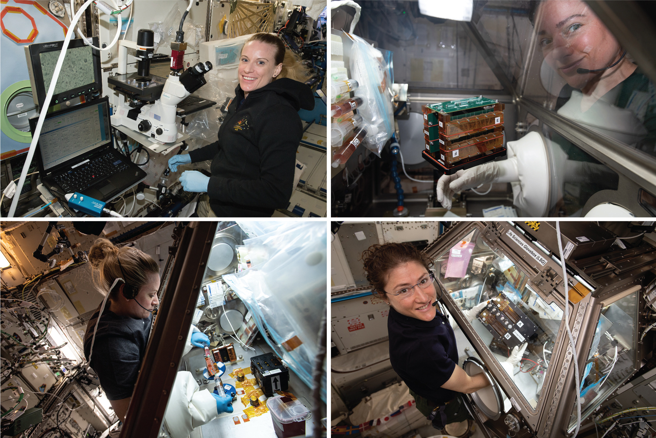 Esempi di ricerche sulle cellule staminali condotte a bordo della Stazione spaziale dalle astronaute Kate Rubins (a sinistra, in alto e in basso), Jessica Meir (in alto a destra) e Christina Koch (in basso a destra). Crediti: Nasa