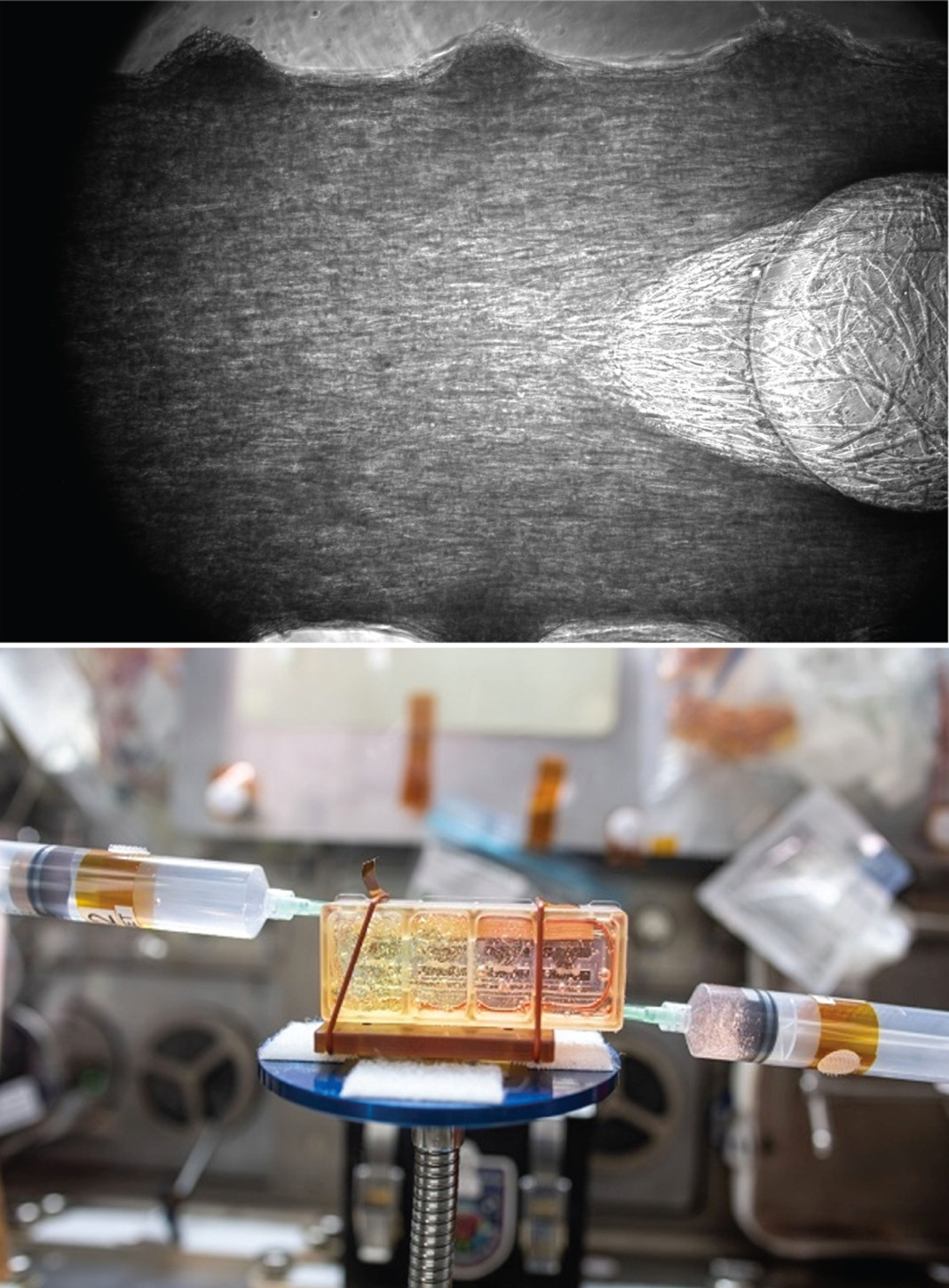 In alto: tessuto muscolare scheletrico ingegnerizzato (crediti: Siobhan Malany e Space Tango). In basso: tessuto cardiaco ingegnerizzato, trattato da un astronauta della Nasa (fuori cornice) nell’ambito di un progetto guidato da Joseph Wu alla Stanford University in collaborazione con BioServe Space Technologies (crediti: Joseph Wu e Nasa)