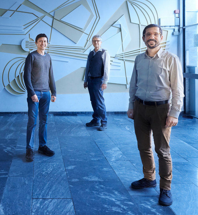 I fisici dell’Università di Bonn coinvolti nello studio: Manolo Rivera Lam (a sinistra), Dieter Meschede (al centro) e Andrea Alberti (a destra). Crediti: Volker Lannert/University of Bonn