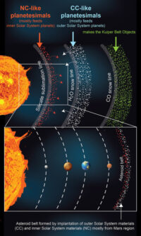 Illustrazione dei tre anelli di formazione planetesimale che potrebbero aver prodotto i pianeti e altre caratteristiche del Sistema solare, secondo il modello computazionale della Rice University. La composizione chimica degli oggetti dell’anello interno (NC, condriti non carbonacee) differisce dalla composizione degli oggetti dell’anello centrale ed esterno (CC, condriti carbonacee). I planetesimi dell’anello interno hanno prodotto i pianeti del Sistema solare interno (in basso) e i planetesimi degli anelli intermedio ed esterno hanno prodotto i pianeti del Sistema solare esterno e la cintura di Kuiper. Alla fascia degli asteroidi hanno contribuito sia l’anello interno che quello intermedio. Crediti: Rajdeep Dasgupta