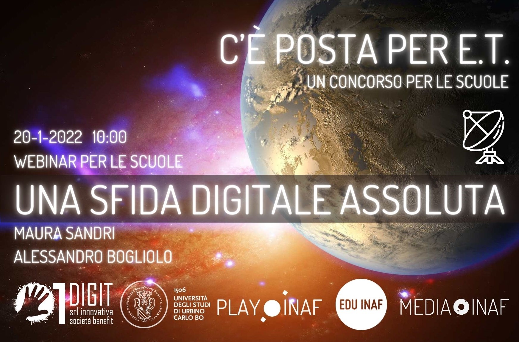 I dettagli del concorso, che si chiuderà il 24 aprile 2022, sono disponibili alla pagina “C’è posta per E.T.” di Edu Inaf. Il concorso, inizialmente rivolto alle scuole secondarie di primo e secondo grado, è stato ora esteso anche alle scuole primarie, che potranno confrontarsi per produrre un proprio messaggio da lanciare insieme al migliore di quelli proposti dalle scuole secondarie.
