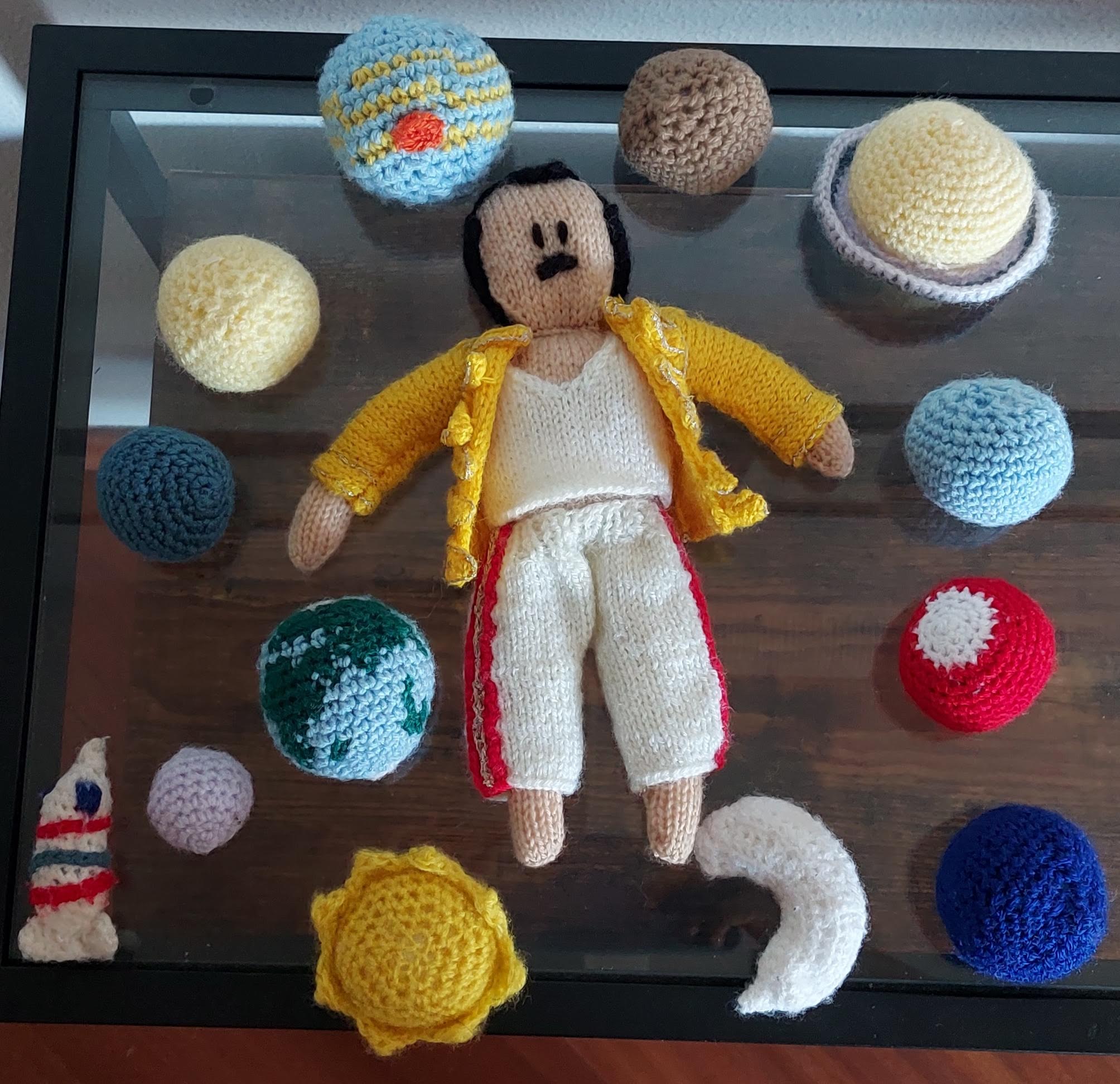 Nasce così una moltitudine di oggetti astrofisici e soggetti legati all’astronomia, fatti a maglia o all’uncinetto, dall’eclissi, in cui un’ammiccante Luna si prepara a occultare un sorridente Sole, a un dettagliatissimo Sistema solare: su Marte si nota la calotta polare, su Giove spicca la Grande macchia rossa, e c’è anche Cerere, considerato l’ottavo pianeta per mezzo secolo dopo la sua scoperta, avvenuta proprio all’Osservatorio di Palermo, a opera di Padre Giuseppe Piazzi nel 1801. Tra le creazioni a tema spaziale figurano anche l’astronauta Samantha Cristoforetti, il musicista e astrofisico Brian May – insieme al collega Freddie Mercury, icona rock dal nome astronomico per eccellenza – e addirittura il logo dell’Inaf, che «per fortuna è un logo molto semplice: basta fare cerchi e quadrati», chiarisce Bonito.