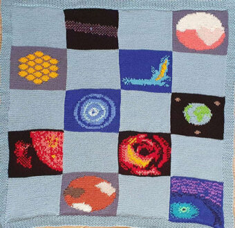 Non lontano, in Scozia, altra terra celebre sia per i greggi di pecore lanose che per i caldi indumenti fatti a maglia, durante la pandemia nasce Knit the Universe. «La scienza può spaventare le persone, l’artigianato no», spiega a Media Inaf la creatrice del progetto, Kate Macdonald, fisica e consulente nel campo dei brevetti di Inverness, nelle Highland scozzesi. «Ho due figlie che da sempre amano creare. Così mi è venuta l’idea di mettere su qualcosa di piccolo da poter realizzare insieme per dimostrare il “tessuto” dello spaziotempo, gli eventi maestosi e la bellezza che ci circonda. Una rappresentazione tangibile delle meraviglie che esistono lì fuori». Sviluppa così l’idea di una trama che pervade l’universo attraverso il lavoro a maglia, prendendo in prestito il concetto di ‘songlines’ (in italiano: le vie dei canti) che permea l’arte dei popoli indigeni dell’Australia. Il progetto prende forma grazie al supporto dell’Institute of Physics Scotland (IopS), dove Macdonald presta servizio volontario come committee secretary e ambasciatrice Stem, con l’aiuto dell’astrofisico e comunicatore scientifico freelance Bryn Pearlstone insieme a Muza Farid e John Maher dell’IopS, pubblicando dieci schemi per il knitting ispirati a immagini dell’universo tra la fine del 2020 e l’inizio del 2021.
