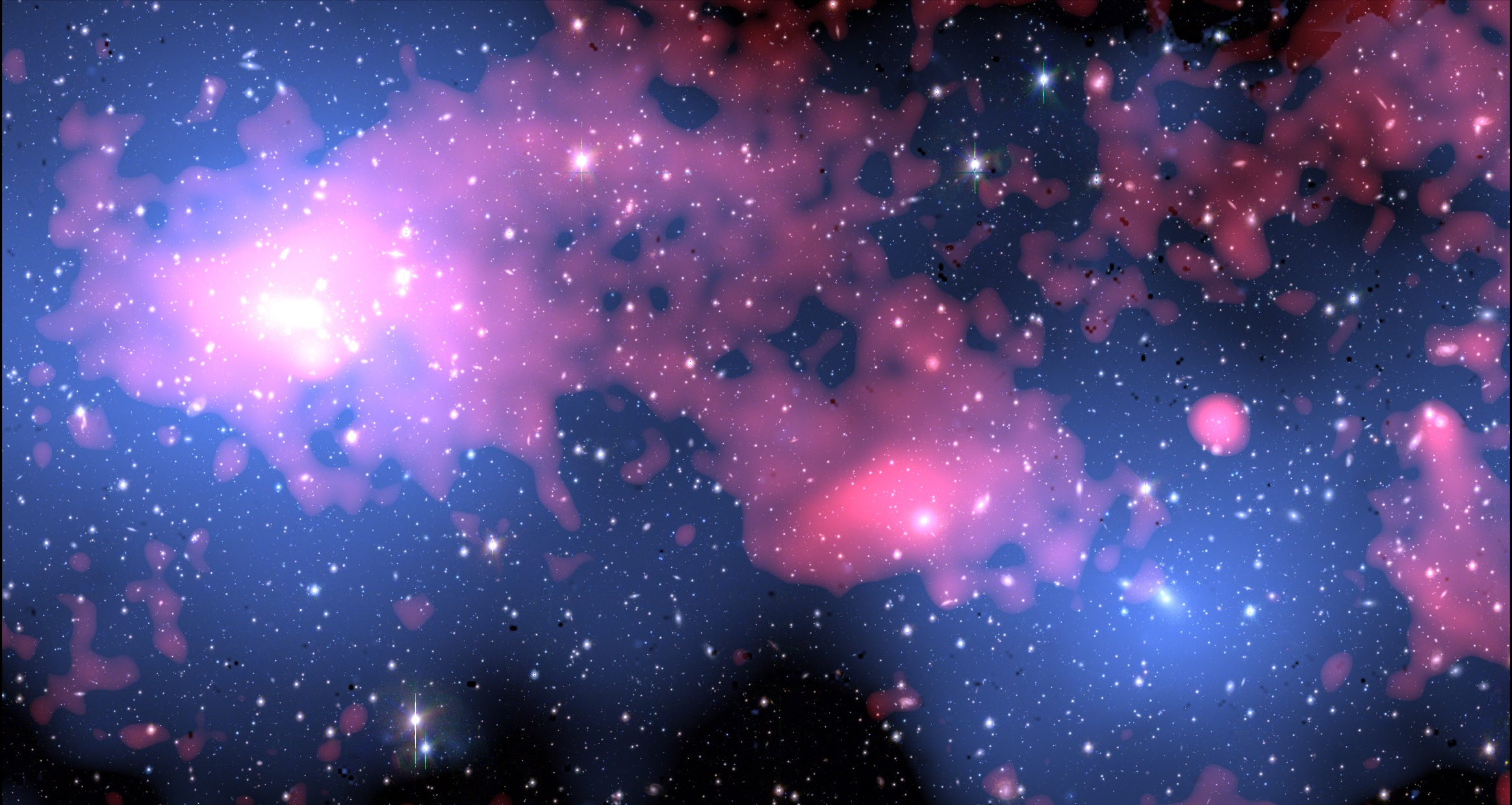 Immagine composita della regione centrale della Shapley Concentration. Nello sfondo l’emissione ottica delle galassie vista da Eso-Vst in banda r; l’emissione del gas caldo che permea tutta la regione è rappresentato in blu ed è stato rivelato da Xmm-Newton; l’emissione radio, rilevata da MeerKat, è rappresentata in rosso. L’intera immagine copre un’area di cielo di circa 3×1.5 Mpc (o 10×5 milioni di anni luce). Crediti: G. Di Gennaro