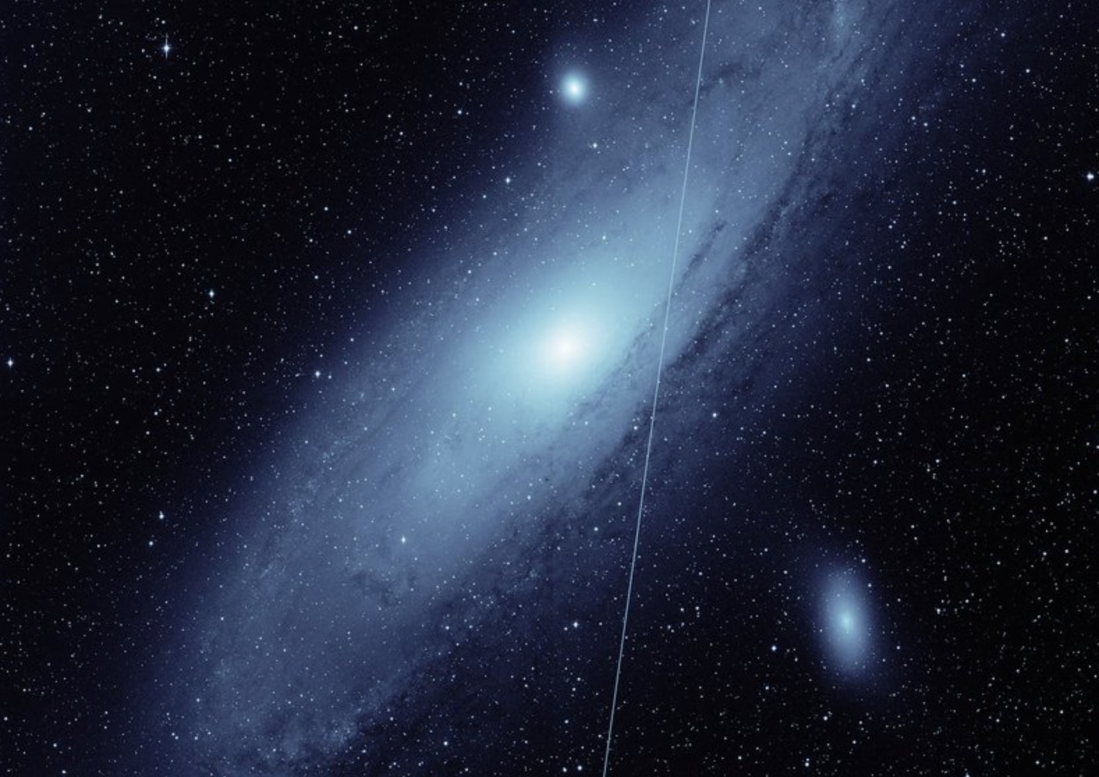 La galassia di Andromeda osservata il 19 maggio 2021. Si nota la scia luminosa dovuta al passaggio di un satellite Starlink. Crediti: Caltech/Palomar Observatory