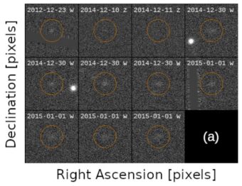 Serie di osservazioni di 2020 XL5 compiute dalla survey Pan-Starrs. I cerchi arancioni evidenziano la posizione dell’oggetto. Crediti: T. Santana-Ros et al., Nature Communications, 2022
