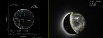 Sistema di riferimento geografico utilizzato nelle osservazioni di Venere da terra, lo stesso sistema utilizzato dalle sonde spaziali in orbita attorno a Venere. Sul lato destro, il sistema è applicato a un’osservazione del lato notturno di Venere (il lato diurno a sinistra è mascherato di nero). Questo sistema consente un’elevata precisione nell’attribuzione di una latitudine e longitudine a ciascun pixel dell’immagine. Crediti: Pedro Machado, et al. 2022