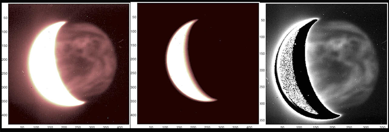Venere vista nel vicino infrarosso con il Telescopio nazionale Galileo (Tng), alle Isole Canarie. Questa sequenza mostra il processo di sottrazione della luminosità del lato diurno di Venere, in modo da poter analizzare i dettagli del lato notturno. Le aree scure sul lato destro della prima e della terza immagine sono nubi, mentre le aree luminose sono regioni meno opache attraverso le quali fuoriesce la radiazione termica (infrarossa) dalla superficie del pianeta. Immagine ottenuta l’11 giugno 2012. Crediti: Pedro Machado, et al. 2022