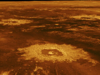 Superficie di Venere, osservata dalla sonda Magellano della Nasa, che ha mappato l’intera superficie del pianeta utilizzando un radar all’inizio degli anni ’90. Si possono notare prove di attività vulcanica e crateri da impatto. Crediti: Nasa/Jpl