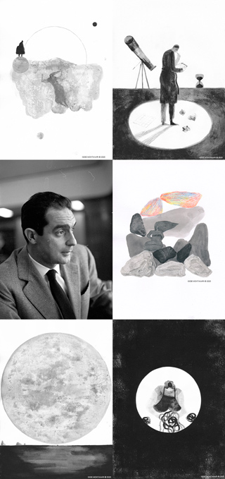 Italo Calvino e alcune delle illustrazioni realizzate da Iside Montanari per il progetto Astrologos. Fonte: astrologos.astro4dev.org