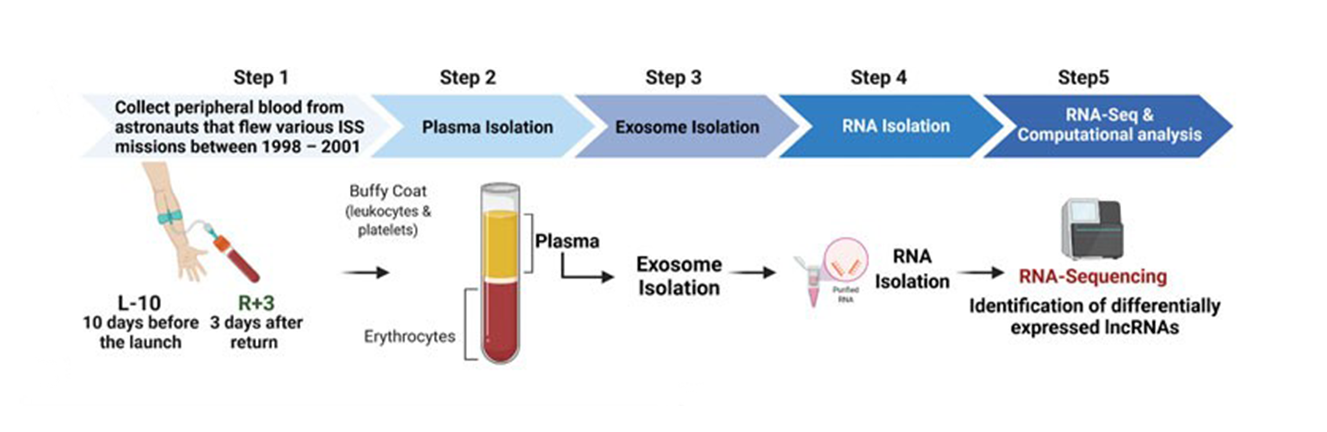 In questo studio, con l’intento di valutare il ruolo di questi Rna lunghi non codificanti nella risposta agli stress del volo spaziale, i ricercatori hanno analizzato vecchi campioni di sangue di astronauti che hanno effettuato missioni relativamente brevi (da 5 a 13 giorni) sulla Stazione spaziale internazionale (Iss) tra il 1998 e il 2001. Il sangue oggetto della ricerca è stato prelevato a suo tempo in due diversi momenti: 10 giorni prima del lancio (il campione controllo) e 3 giorni dopo il ritorno (il campione test).