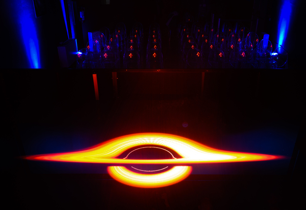 Sospeso sul palco dell’Holotheater dell’Inaf di Roma, l’ologramma del buco nero realizzato da Jeremy Schnittman della Nasa. Crediti: Maria Teresa Menna/Inaf