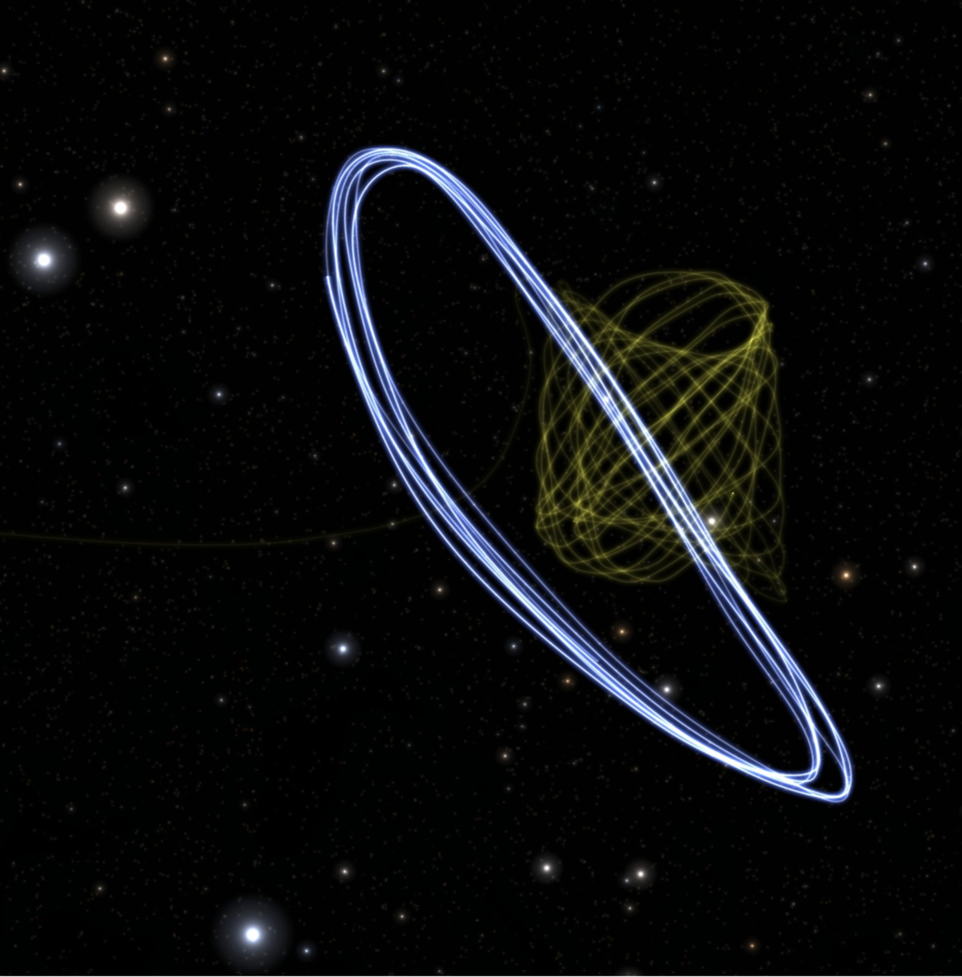 Gaia orbita attorno al secondo punto di Lagrange (L2) in un’orbita di Lissajous. Il James Webb Space Telescope (Jwst) orbita in L2 lungo un’orbita ad alone. I telescopi distano tra 400mila e 1.1 milioni di chilometri, a seconda di dove si trovano lungo le rispettive orbite. Questa immagine mostra le dimensioni e le posizioni relative dell’orbita di Gaia (gialla) e dell’orbita di Webb (bianca). In questa vista la Terra si trova a sinistra, non lontano dall’inquadratura. Gli anelli di Lissajous di Gaia hanno L2 proprio al centro, mentre gli anelli dell’orbita di Webb sono più vicini alla Terra di circa 100mila chilometri, in media. Crediti: Esa/Gaia/Dpac