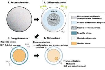 Sulla base dei risultati trovati, il gruppo di ricerca ha delineato uno scenario per la formazione e l’evoluzione degli asteroidi della fascia principale esterna. Il processo proposto si articola in quattro fasi: accrescimento, differenziazione e alterazione, congelamento e distruzione. Dopo la prima fase di accrescimento, il corpo si riscalda e si differenzia in roccia, nella parte più interna, e acqua sotto forma di ghiaccio, nella parte più esterna. A queste fasi ne segue una di congelamento, la cui durata dipende dalle dimensioni del corpo. Ora, le regioni interne ed esterne hanno mineralogie e assorbimenti spettrali diversi. Infine, con l’ultima fase, in caso di impatti, i frammenti del nucleo sopravvivono e diventano meteoriti.