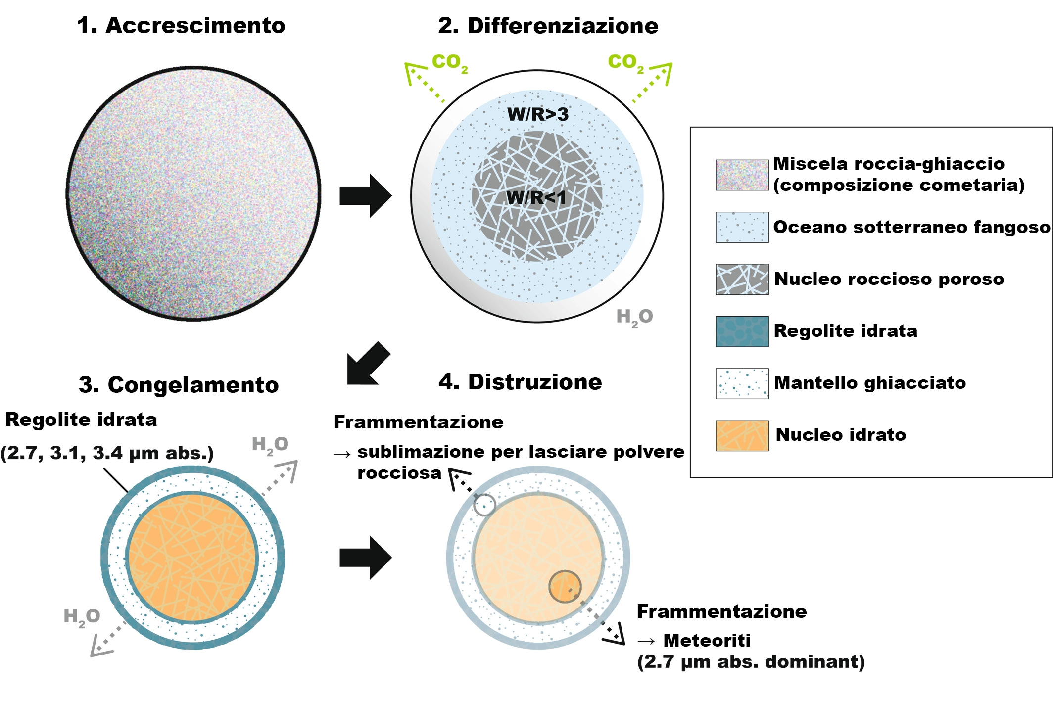 Le quattro fasi di formazione ed evoluzione delle meteoriti (cliccare per ingrandire). I corpi si sarebbero formati in corpi differenziati acqua-roccia, formati per accrescimento come planetesimi ghiacciati oltre le snow line di ammoniaca e anidride carbonica, con l’accumulo di ghiaccio di ammoniaca e anidride carbonica e ghiaccio di acqua (Fase 1). Per il riscaldamento, questi corpi avrebbero perso anidride carbonica e un ulteriore riscaldamento avrebbe differenziato acqua e roccia all’interno del corpo, portando così alla formazione di un nucleo roccioso poroso con intorno un oceano fangoso coperto di ghiaccio (Fase 2). A questa, segue una fase di congelamento. Prima di una significativa perdita di acqua, il congelamento porta alla comparsa di particolari minerali nel mantello ghiacciato (Fase 3). Fino ad arrivare all’ultima fase, che porta alla formazione di frammenti (Fase 4). Crediti: Kurokawa et al., 2021, Figura 7. Versione in italiano a cura di Media Inaf