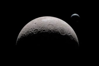 Una vista simulata della Luna dal suo lato più lontano, con la Terra sullo sfondo. Crediti: Nasa’s Scientific Visualization Studio
