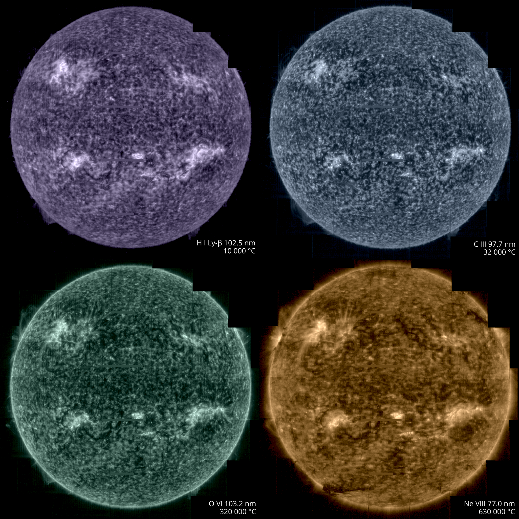 Ciascuna immagine mostra un differente “volto” del Sole, ovvero la luce emessa a diverse lunghezze corrispondenti a diversi strati della bassa atmosfera. Nella sequenza, in particolare, il viola corrisponde all’idrogeno gassoso, il blu al carbonio, il verde all’ossigeno e il giallo al neon, con temperature associate rispettivamente di 10mila, 32mila, 320mila e 630mila gradi Celsius. Anche in questo caso, ciascuna immagine è un mosaico di 25 scatti singoli.