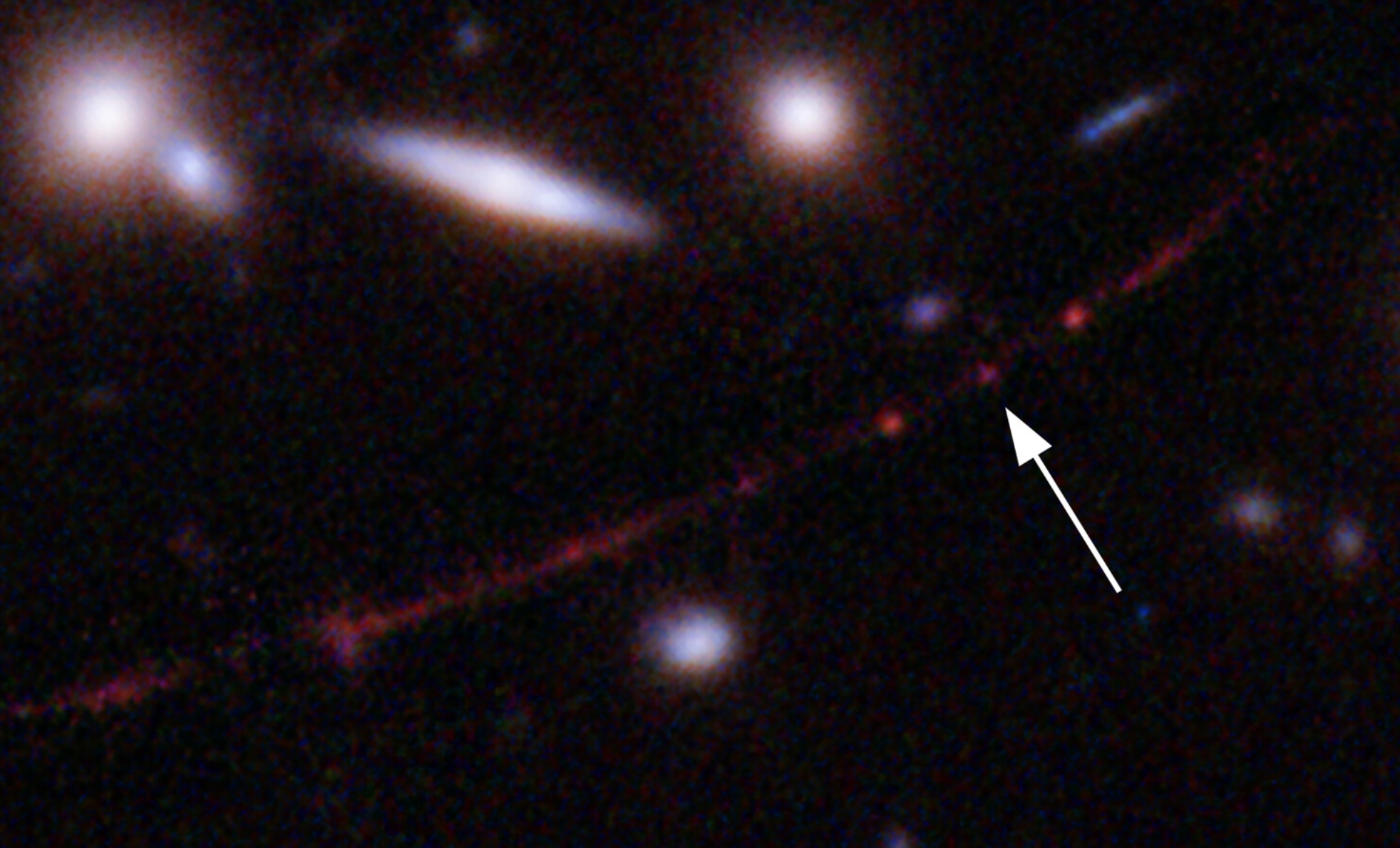 Gli oggetti più piccoli visti in precedenza a una distanza così grande erano interi ammassi di stelle all’interno di galassie primordiali, mentre Earendel è una stella singola, un puntino luminoso osservato grazie al raro allineamento cosmico con WHL0137-08, un enorme ammasso di galassie che si trova tra noi ed Earendel e che, come un’immensa lente di ingrandimento naturale, ha deformando lo spazio-tempo facendo emergere la luce della stella dal bagliore generale della sua galassia ospite, che appare come una macchia rossa nel cielo.