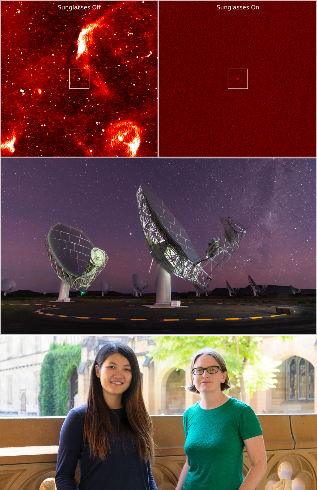 In alto, la pulsar osservata in modalità “normale” (a sx) e con gli “occhiali polarizzati” (a dx). Al centro, il radiotelescopio MeerKat. In basso, da sinistra, Yuanming Wang e Tara Murphy dell’università di Sydney. Crediti: Yuanming Wang (per la pulsar), Sarao (per la foto di MeerKat) e The University of Sydney/Louise M Cooper (per la foto delle due ricercatrici)