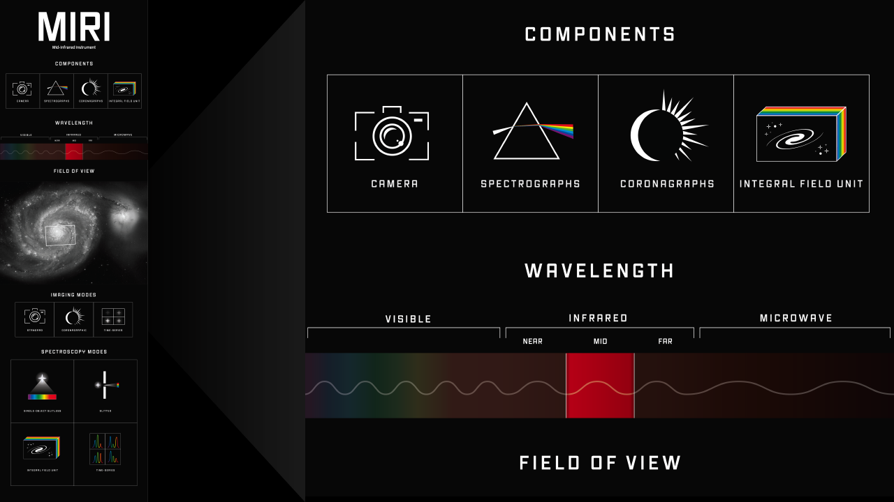 - La modalità imaging con Miri va bene per tutte le osservazioni nel medio infrarosso, per esempio per tracciare la distribuzione di polveri e gas freddo nelle regioni di formazione stellare della la Via Lattea e di altre galassie, come Messier 33.