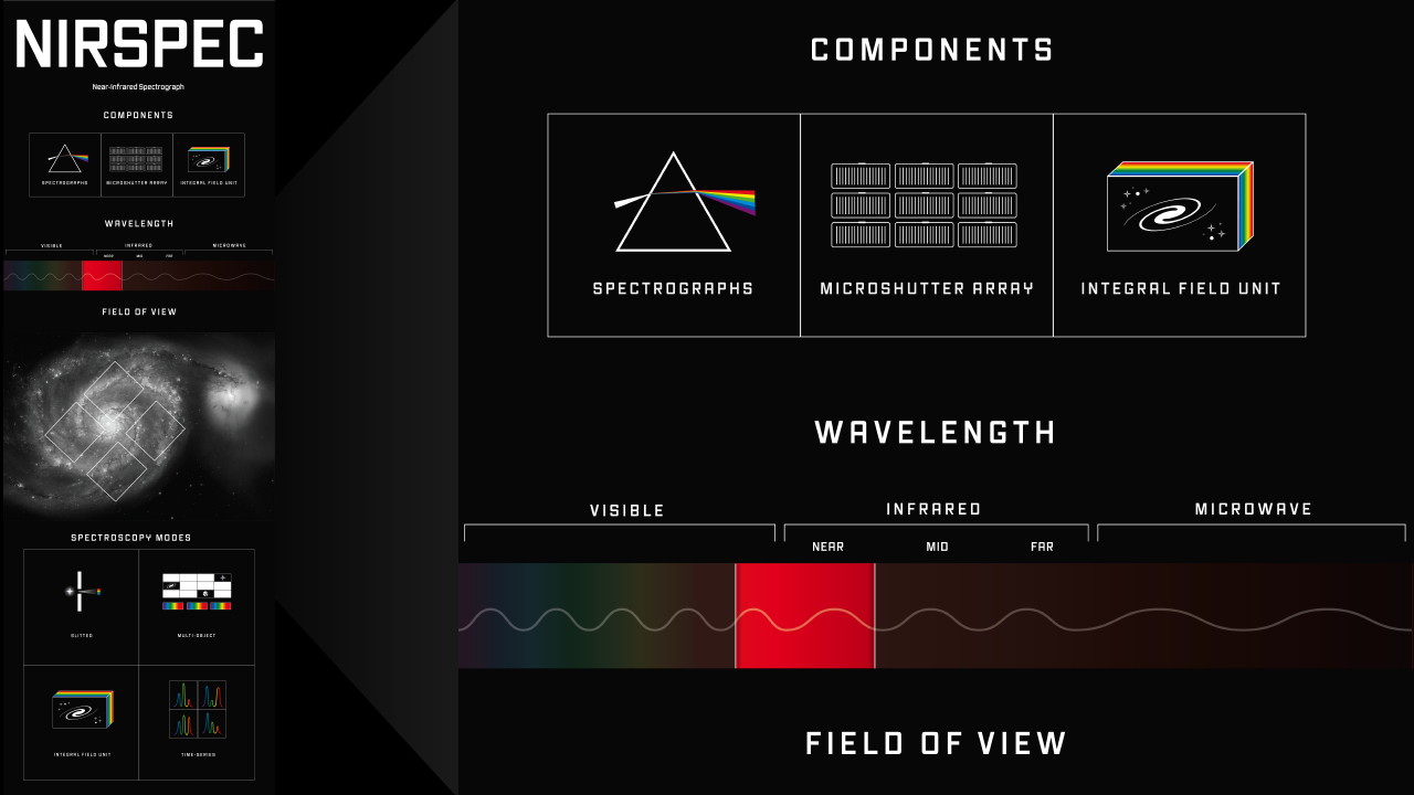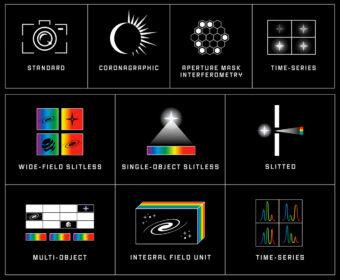 Le modalità spettroscopiche possibili con Webb sono invece sei: 1) a grande campo senza fenditura (slitless), con la quale viene misurato lo spettro di tutti gli oggetti presenti nel campo di vista; 2) a singolo oggetto senza fenditura, nella quale la sorgente osservata, per esempio una stella, viene sfuocata, così da diffondere la sua luce su molti pixel, evitando in tal modo di saturare i rivelatori; 3) con fenditura, per ottenere lo spettro di una singola sorgente con la massima sensibilità possibile; 4) spettroscopia multi-oggetto, una tecnica che grazie al controllo individuale di 250mila singoli micro-otturatori offre i vantaggi sia della spettroscopia a singolo oggetto che di quella a grande campo, consentendo di ottenere spettri “puliti” di fino a cento oggetti alla volta; 5) a campo integrale, tecnica con la quale – suddividendo l’immagine in piccole porzioni e producendo uno spettro per ciascun loro pixel – si riescono a ottenere informazioni spettroscopiche dettagliate dell’oggetto astronomico osservato; 6) infine, come per le modalità di imaging, anche quelle spettroscopiche prevedono osservazione di serie temporali, in questo caso relative a serie di dati spettroscopici.