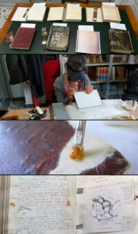 Alcune fasi dell’opera di restauro. Dall’alto: i volumi prima del restauro; restauratrice al lavoro; dettaglio del restauro di una copertina con collante Tylose MH300; una doppia pagina con le osservazioni del giugno 1890, dove è possibile notare l’impiego di pezzetti di francobolli per attaccare alle pagine schizzi e disegni (cliccare per ingrandire). Crediti: A. Mandrino/Inaf Brera