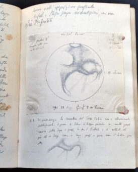 I diari fortunatamente non presentavano nessuna traccia di muffe, tarli o parassiti che avessero intaccato le parti scritte o disegnate. I danni erano solo legati alla loro età, quindi copertine lacere o staccate, dorsi logori o addirittura spezzati, con le legature allentate: erano “squinternati”, per usare una parola facilmente comprensibile. Lungo i margini delle pagine, poi, la carta, era disidratata e fragile, con piccoli strappi: una carta di scarsa qualità e di poco prezzo all’epoca. Certo Schiaparelli, scrivendo questi diari, non deve avere mai pensato alla conservazione perenne alla quale, invece, sono oggi destinati, in quanto beni culturali della nostra nazione. A lui, pragmatico com’era, serviva semplicemente un quaderno abbastanza comodo su cui scrivere di notte, utilizzando addirittura pezzetti di francobolli per attaccare alle pagine schizzi e disegni fatti su foglietti separati.