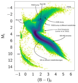 Una fra le potenzialità della fotometria sintetica applicata ai big data è illustrata da questo diagramma colore-magnitudine, ottenuto direttamente dai dati di Gaia estraendo, appunto, i colori dagli spettri di milioni di stelle. Sono contrassegnati alcuni fra i passaggi fondamentali dell’evoluzione stellare. Crediti: Esa/Gaia/Dpac – Cc By-Sa 3.0 Igo. Ringraziamenti: M. Bellazzini