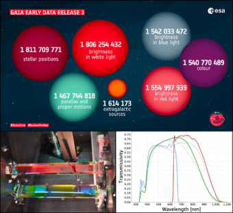 Nel pannello in alto, infografica sul catalogo Early Data Release 3 in cifre. In basso a sinistra un dettaglio dei prismi dei due fotometri Bp e Rp. In basso a destra, in blu e rosso, le loro bande passanti. Crediti: Esa/Gaia/Dpac; Airbus Ds