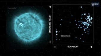 Fotogramma, tratto dal video di Jeffrey C. Chase “How rotation speed and centrifugal breakout affect star brightness” (UDelaware), che mostra la relazione tra la velocità di rotazione delle stelle massicce e il campo magnetico
