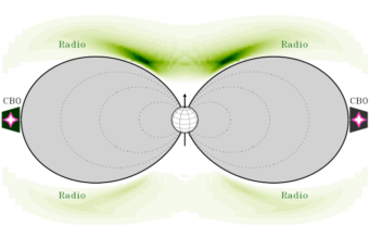 Magnetosfera di una tipica stella massiccia che emette onde radio. Il campo magnetico ha una semplice geometria di tipo dipolare. L’area grigia rappresenta la regione della magnetosfera in cui il plasma è intrappolato dalle linee chiuse del campo magnetico. Alla distanza in cui la forza centrifuga che agisce sul plasma rompe le linee di forza del campo magnetico si origina il meccanismo di breakout centrifugo (Cbo) che accelera gli elettroni rendendoli capaci di emettere onde radio (regione esterna di colore verde)
