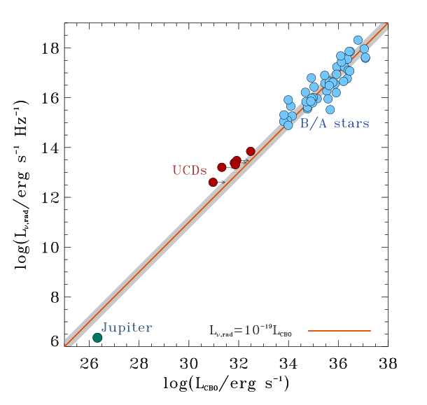 La figura mostrata qui a fianco riassume i risultati di questi tre articoli. I simboli azzurri rappresentano i due campioni di stelle analizzati da Leto e da Shultz, la linea diagonale rappresenta la legge che esprime la luminosità radio in funzione della potenza rilasciata a causa del breakout centrifugo. Per comprendere se questa legge è valida solo per le stelle B/A magnetiche, oppure può essere considerata una legge che gode di una validità universale capace di spiegare la luminosità radio delle magnetosfere co-rotanti in generale, nel diagramma sono state riportate anche le posizioni di altri oggetti di interesse astrofisico, ma che sono molto diversi dalle stelle calde e magnetiche. Gli oggetti esaminati sono le stelle ultra-fredde e le nane brune, in generale definite Ultra Cool Dwarfs (Ucd), simboli in rosso, e il pianeta Giove, simbolo verde. Il pianeta Giove e le UCDs posseggono un campo magnetico, che, come nel caso delle stelle magnetiche di tipo B/A, ha una geometria semplice. Sia le stelle ultra-fredde che Giove emettono radiazione di giro-sincrotrone prodotta da elettroni relativistici. La posizione nel diagramma occupata da questi oggetti è in accordo con le predizioni della legge teorica. Con le dovute precauzioni legate all’esiguo numero di oggetti analizzati diversi dalle stelle B/A, si hanno indicazioni convincenti per cui è plausibile estendere la validità della legge a tutte le magnetosfere dominate da un campo magnetico stabile e dalla geometria semplice.