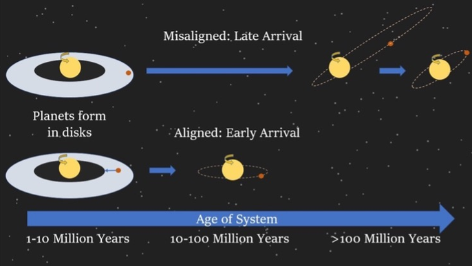 Alcuni gioviani caldi hanno orbite ben allineate alla rotazione della loro stella, come i pianeti del Sistema solare; altri assolutamente no. Gli scienziati non sono stati in grado di dimostrare se le diverse configurazioni fossero il prodotto di un diverso processo di formazione oppure delle interazioni mareali tra i pianeti e le stelle. «Senza questo metodo davvero preciso per misurare le età mancavano sempre informazioni», aggiunge Hamer.