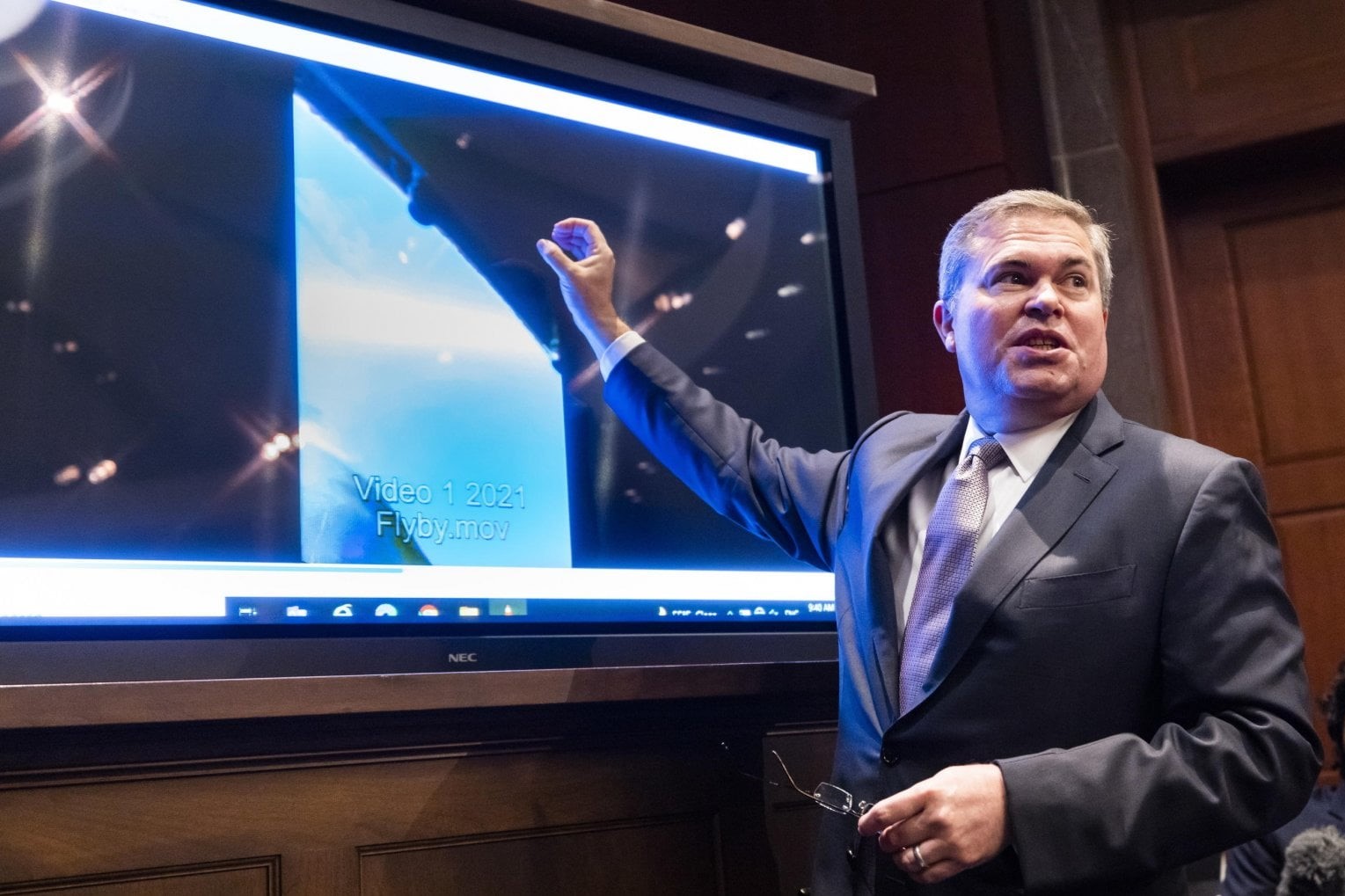 Scott Bray, vice direttore dell’intelligence navale mostra un video su di un fenomeno “non identificato”. Crediti: Ansa