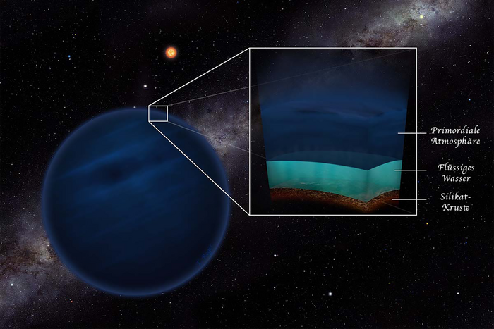 I pianeti di piccola massa con un’atmosfera primordiale di idrogeno ed elio potrebbero avere temperature e pressioni tali da consentire la presenza di acqua liquida. La presenza di acqua liquida è favorevole alla vita, e questi pianeti potrebbero ospitare habitat esotici per miliardi di anni. Crediti: Thibaut Roger – Universität Bern – Universität Zürich