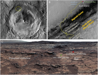 In A) il sito di atterraggio di Curiosity nel Cratere Gale di Marte. In (B) il percorso fatto dal rover dal 2012 al 2022. Il cerchio rosso mostra la posizione del sito di Cumberland nella Yellowknife Bay. In (C) una vista in scala della Yellowknife Bay, con indicate, in rosso e in verde, i siti di perforazione di John Klein e Cumberland. Crediti immagini: Nasa/Jpl-Caltech/Asu, Nasa/Jpl-Caltech/Univ. of Arizona and Scott Rowland, Nasa Jpl-Caltech/Msss