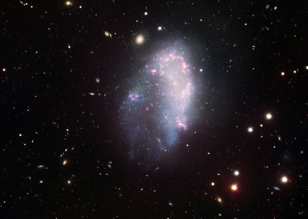 La galassia nana Ngc 1427a si trova nell’ammasso di galassie della Fornace e risente di disturbi che non sarebbero possibili se questa galassia fosse circondata da un alone di materia oscura pesante ed esteso, come richiesto dalla cosmologia standard. Crediti: Eso