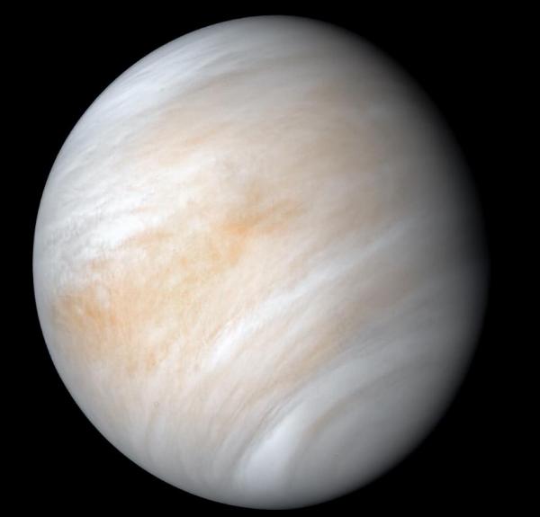 Un’immagine rielaborata dei dati archiviati del Mariner 10 raccolti nel 1974. Si tratta di un’immagine in falsi colori creata utilizzando filtri arancione e ultravioletti rispettivamente per i canali rosso e blu. Le nuvole si trovano a circa 60 chilometri di altitudine e l’immagine illustra la presenza di uno sconosciuto assorbitore di raggi ultravioletti nell’atmosfera, un mistero irrisolto di Venere da tempo. Crediti: Nasa/Jpl-Caltech