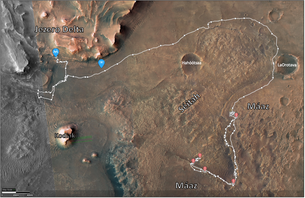 Da quando è atterrato nel cratere Jezero, il 18 febbraio 2021, Perseverance si è aggirato lungo i bordi di un’area chiamata Séítah, dove ha campionato le rocce in due siti, e ha visitato un’altra area chiamata Máaz, raccogliendo campioni di altre due rocce. Poi ha percorso un tragitto tortuoso verso una delle conformazioni principali del cratere, il delta di un antico fiume (in alto a sinistra). I punti rossi indicano le posizioni di campionamento del fondo del cratere. I punti blu indicano le posizioni attuali di Perseverance (a sinistra) e dell’elicotterino Ingenuity (a destra). Crediti: Nasa