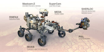 Immagine che mostra i sette strumenti di cui è dotato il rover Perseverance per condurre le sue indagini scientifiche e tecnologiche. Lo strumento Moxie si trova sul lato anteriore destro. Crediti: Nasa