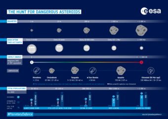 Infografica Esa che censisce i diversi tipi di asteroidi Near-Earth Object in base al diametro. Per ogni range di diametro è mostrato anche il numero degli oggetti scoperti e una stima della popolazione reale. Crediti: Esa