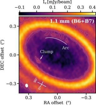 A circa 42 unità astronomiche dalla stella – ossia 42 volte la distanza della Terra dal Sole – gli autori hanno scoperto un anello polveroso con due addensamenti separati e luminosi di materiale orbitante al suo interno: un piccolo grumo e un arco più esteso, separati di 120 gradi. Esaminando a lungo lo scenario con modelli computerizzati per capire cosa stesse causando l’accumulo di materiale, hanno capito che le dimensioni e le posizioni corrispondevano a quanto previsto dal modello nel caso in cui tra di loro fosse presente un pianeta. «Questo arco e questo grumo sono separati di circa 120 gradi», dice. «Quel grado di separazione non capita per caso, è significativo da un punto di vista matematico».