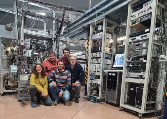 Da sinistra a destra: Marta Civitani, Giovanni Pareschi, Simone Iovenitti, Giacomo Rivolta e Vincenzo Cotroneo alla beamline BEAR di IOM-CNR presso il sincrotrone Elettra di Trieste