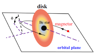 Nel secondo studio, Fayin Wang, ricercatore alla Nanjing University, anch’essa in Cina, e colleghi hanno utilizzato invece un modello fisico per spiegare le caratteristiche osservate di Frb 20201124A. Il modello prevede che il segnale ripetuto di Frb 20201124A provenga da un sistema binario contenente una magnetar e una stella Be, astri molto più caldi e più grandi del Sole con un di disco di descrescimento costituito da materiale espulso dal corpo celeste. Gli addetti ai lavori chiamano questi sistemi Be/X-ray binaries (BeXrb).