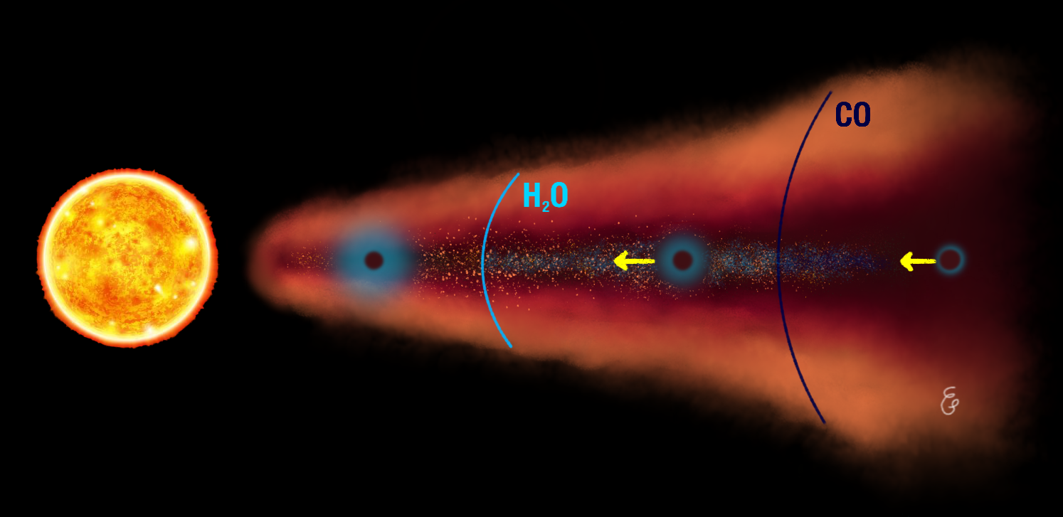 Schema di formazione di un pianeta gigante in un disco protoplanetario attorno a una stella. Il pianeta migra nel disco e accresce gas e solidi di diversa composizione chimica. Quest’ultima è influenzata dalla presenza delle snowline, regioni del disco in cui la temperatura è tale da causare la condensazione su grani di polvere di specifiche specie molecolari, rimuovendole dalla fase gassosa. Nello schema vengono indicate le snowline dell’acqua e del monossido di carbonio ma in un disco protoplanetario ne esistono molte di più. Il materiale accresciuto andrà a costituire l’atmosfera planetaria che telescopi come Ariel permetteranno di osservare e che sarà il punto di partenza per ricostruire la storia di formazione dei pianeti giganti. Crediti: Elenia Pacetti (Sapienza/Inaf)