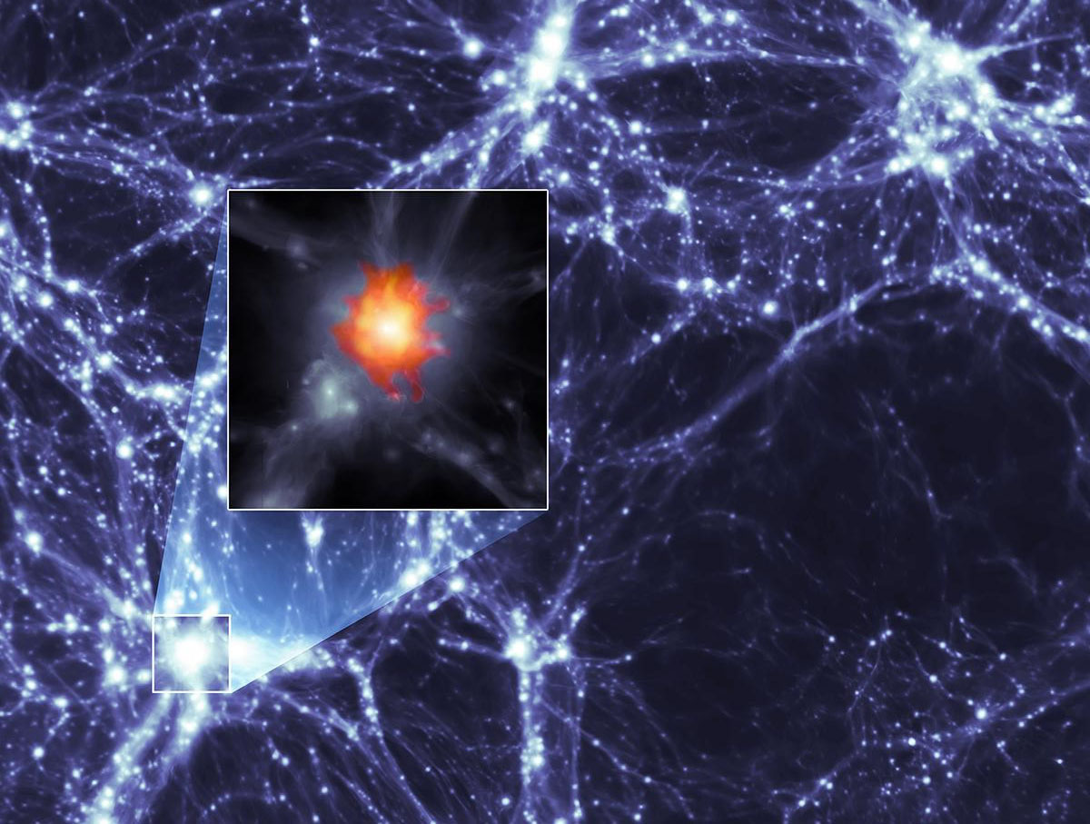 Simulazione al computer della struttura a grande scala dell’universo. Nel riquadro è rappresentato l’ingrandimento di un ammasso di galassie attorno al quale è stato osservato un Megahalo (in arancio è evidenziata l’emissione radio associata, dalle osservazioni di Lofar). Crediti: Virginia Cuciti, Astron