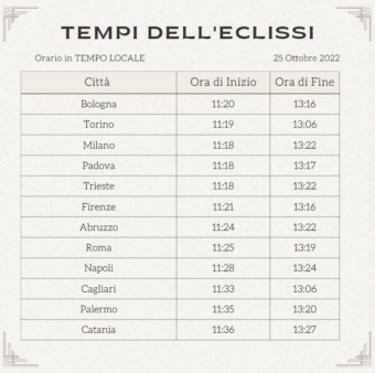 Tempi di inizio e fine dell’eclissi di Sole del 25 ottobre 2022 nelle principali città italiane, sedi di strutture dell’Inaf